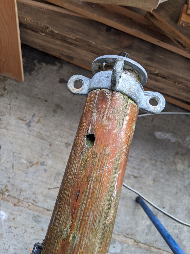 There was also rot in the base of the mast resulting in the mast being loose in the holder. I used Rot Fix epoxy, glued in sister wood pieces and finally epoxy wood. The mast is solid now. There is also a small extension on the top to allow installation of a anemometer. The anemometer also provides GPS to the radio.